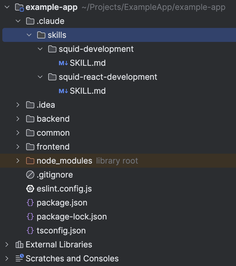 The generated project includes Claude Code skills located in .claude/skills/ at the project root. These skills provide Claude with detailed, structured knowledge about how to develop on Squid using its built-in features. Type /skills in the Claude Code prompt to see available skills. They cover: